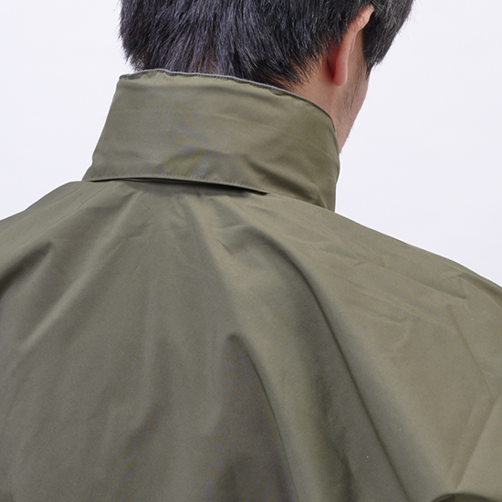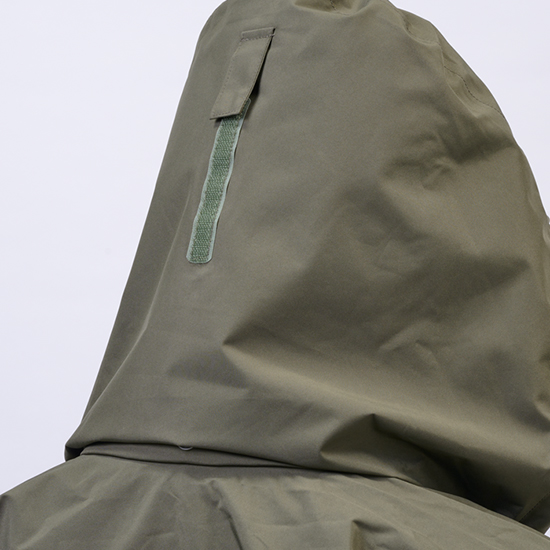 - 高めの襟にフードを収納できます。フード内に水が溜まらず衣服内への水の浸入を防げます。