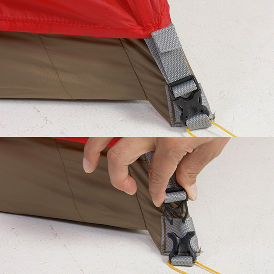 - フライシートと本体を固定するワンタッチ式バックル。フライシート側のテープで張り具合も調整できます。