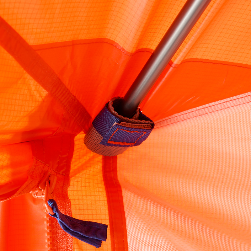 - テント本体四隅は、スリーブによりポールと接続。剛性を高めながら、使用中に破損しにくい構造。