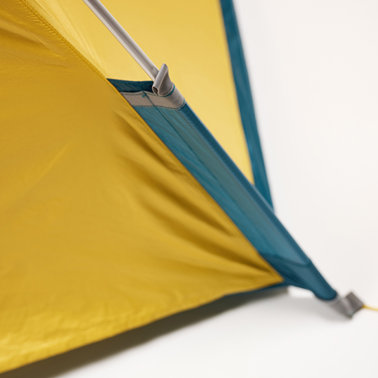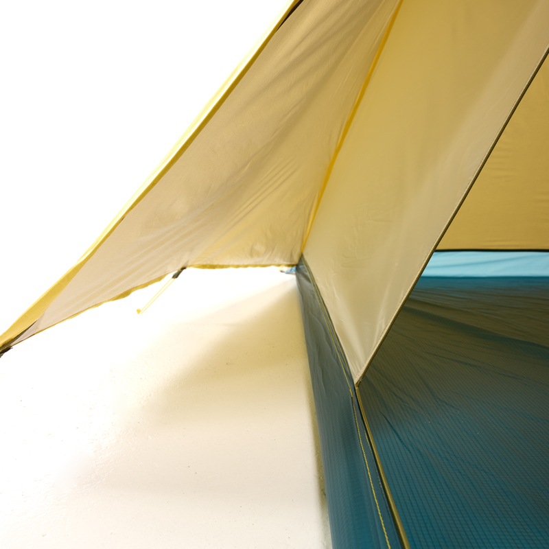 今回のモデルチェンジは、テントパネルを、東レ・高通気エントラントから【疎水性多孔質ノンコーティングePTFEメンブレン】e-Ventに変更し、グランド部も、ポリエステル30Dリップストップから、さらに軽量で強度にも優れた610ナイロン20Dダブルリップストップに変更しました。