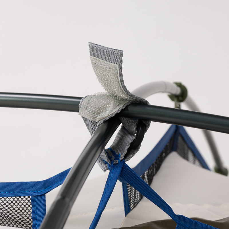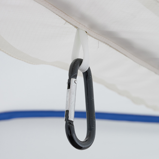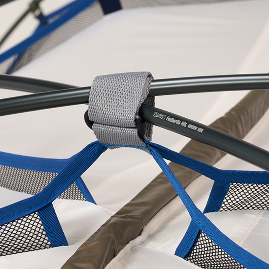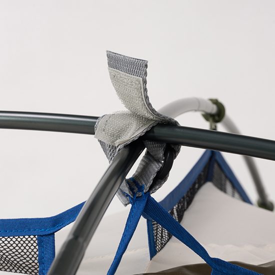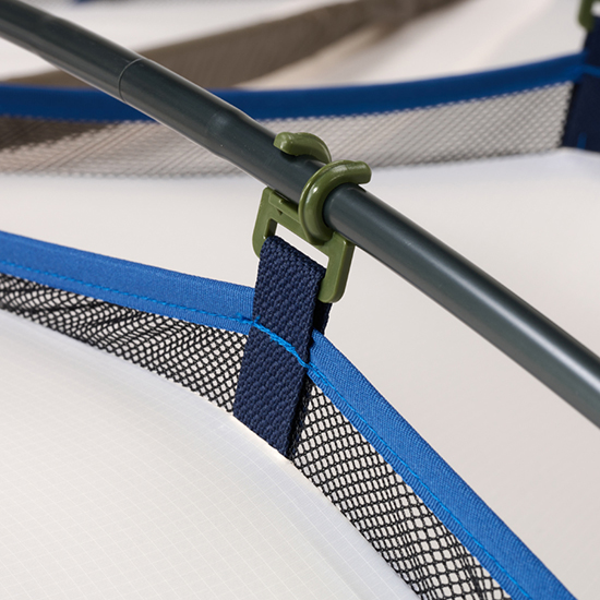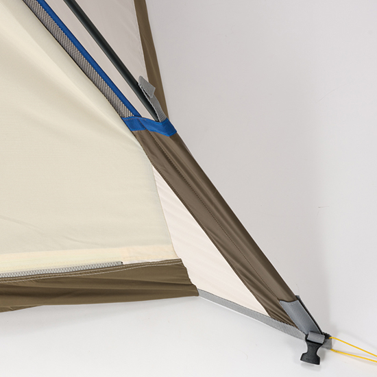 - テント本体四隅は、スリーブによりポールと接続。剛性を高めながら、使用中に破損しにくい構造。