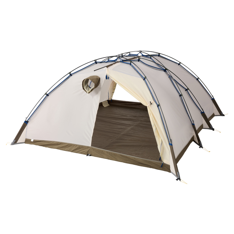 - 3人用ドームテント2つを天井ポールで連結したようなデザインにすることであえて天井を低くして耐風性の強いテントを実現。